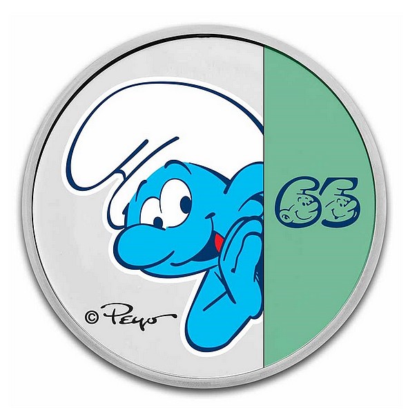 Jednouncová ryzí (99,9 %) stříbrná mince s motivem Šmoulů k 65. výročí. Šmoulové se poprvé objevili v dobrodružství Johana a Peewita „Šmoulové a kouzelná flétna“, publikovaném v belgickém komiksovém časopise v roce 1958. Tato oblíbená modrá stvoření jsou známá tím, že žijí v domech ve tvaru hub ve Šmoulí vesnici umístěné v lese.
