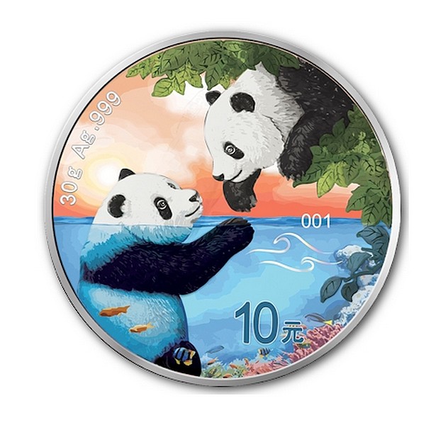 Třicetigramová ryzí (99,9 %) stříbrná mince s motivem dvou pand jednoho ze čtyř živlů, zde zobrazuje živel Voda. Čtyři čísla jsou poctou rovnováze v přírodě a silám vesmíru. Kvůli změnám již mince není zákonným platidlem.