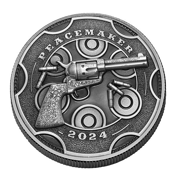 Jednouncová ryzí (99,9 %) stříbrná mince ve starožitné úpravě věnována zbrani Peacemaker, známé také jako Colt Single Action Army. První revolver s uzavřeným nábojem. Výrobcem byl Colts Patent Firearms Manufacturing v roce 1873.
