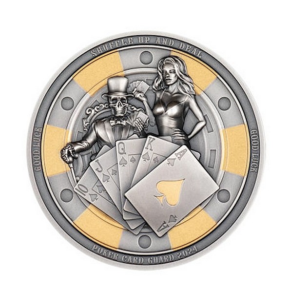 Jednouncová ryzí (99,9 %) stříbrná mince ve starožitné úpravě s motivem pokerového ochránce karet. Slouží jako ochrana před nechtěným pohledem nebo náhodným vystavením hracích karet je ideální pro pokerové nadšence. Naše pozornost padne na svůdnou dámu, která hrdě předkládá své karty, a elegantně oblečenou Grim Reaper, kterou částečně skrývají piky Royal Flush. Pozadí tvoří umělecky navržený, částečně pozlacený pokerový žeton s nápisy „Shuffle up and deal“ a „Good Luck“. „Poker Card Guard“ – chytře vyrobený, dovedně kombinuje řemeslo s funkčností. Nezbytnost pro repertoár každého pokerového hráče.
