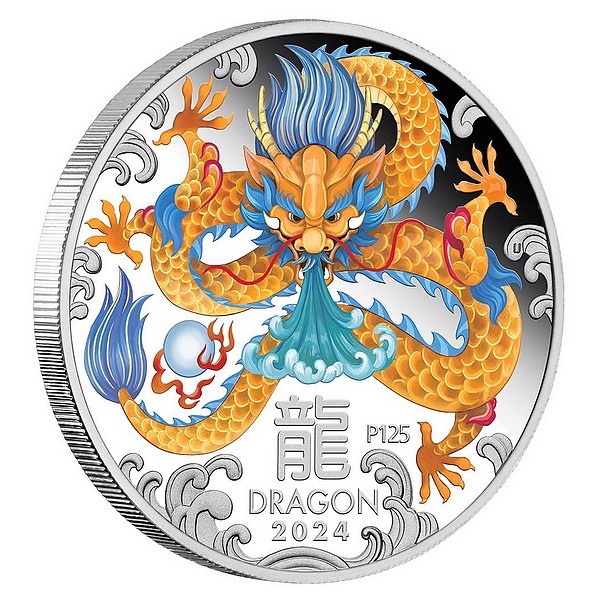 Jednouncová ryzí (99,9 %) stříbrná mince ve špičkové (proof) kvalitě kolorovaná s motivem draka. Rok 2024 je v lunárním kalendáři rokem draka.